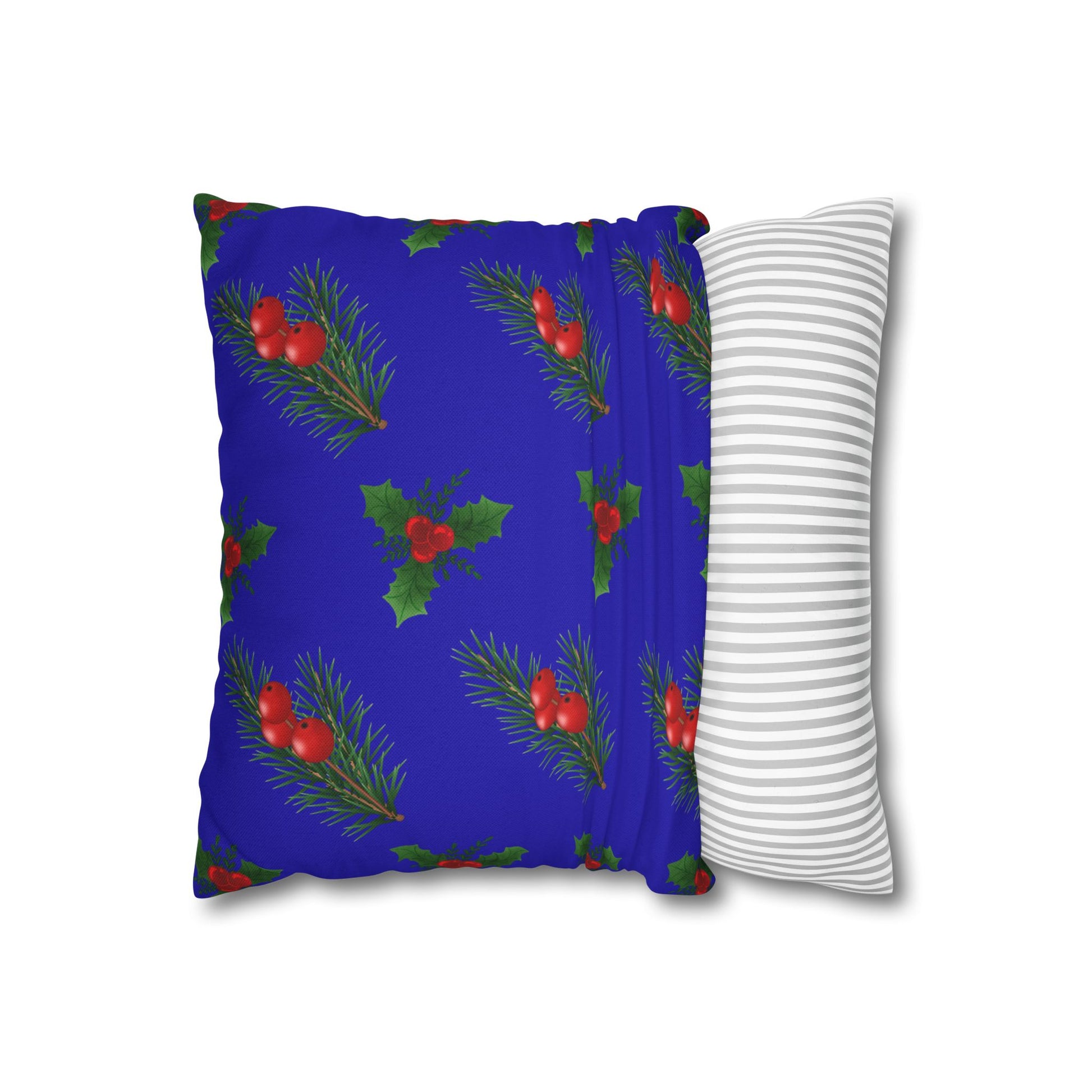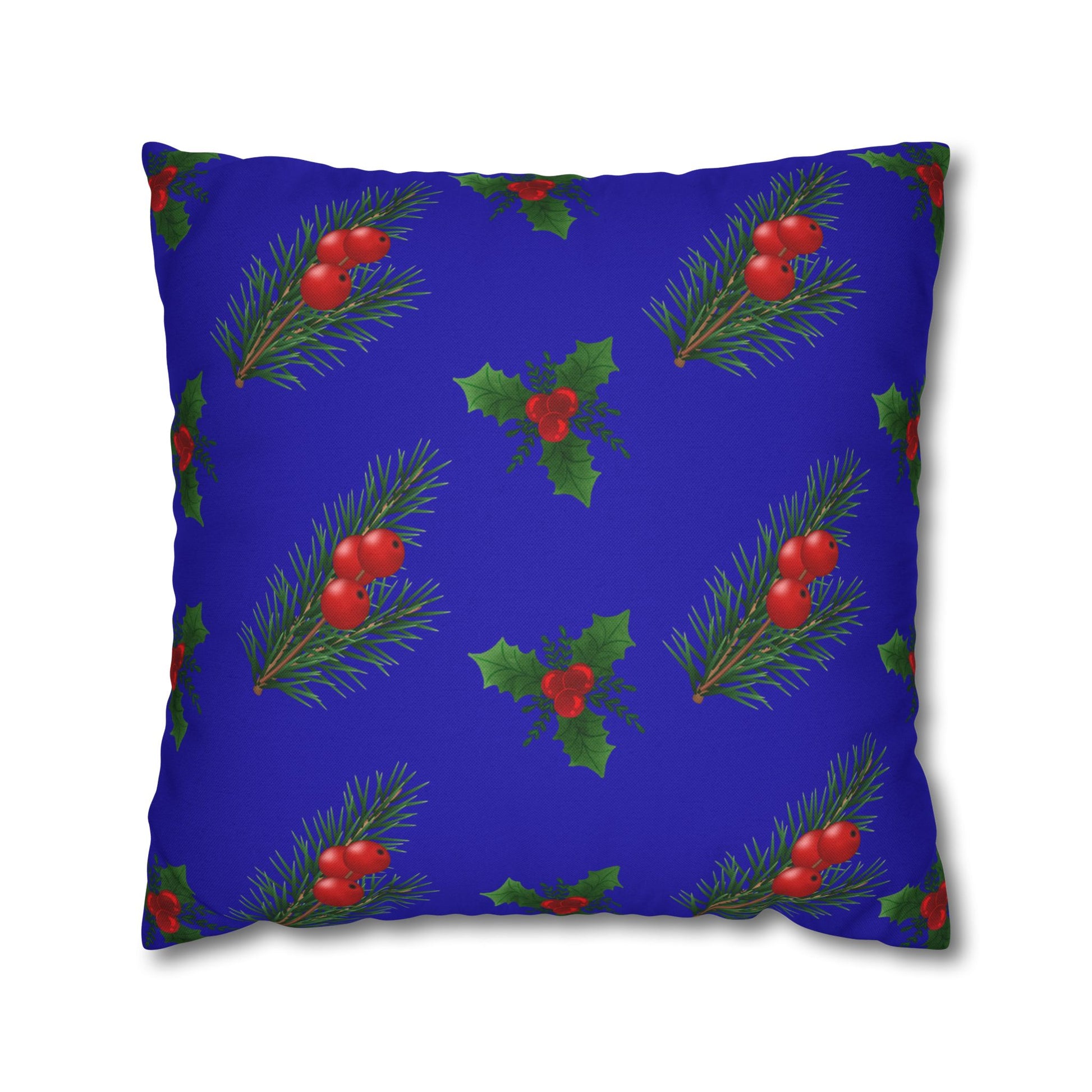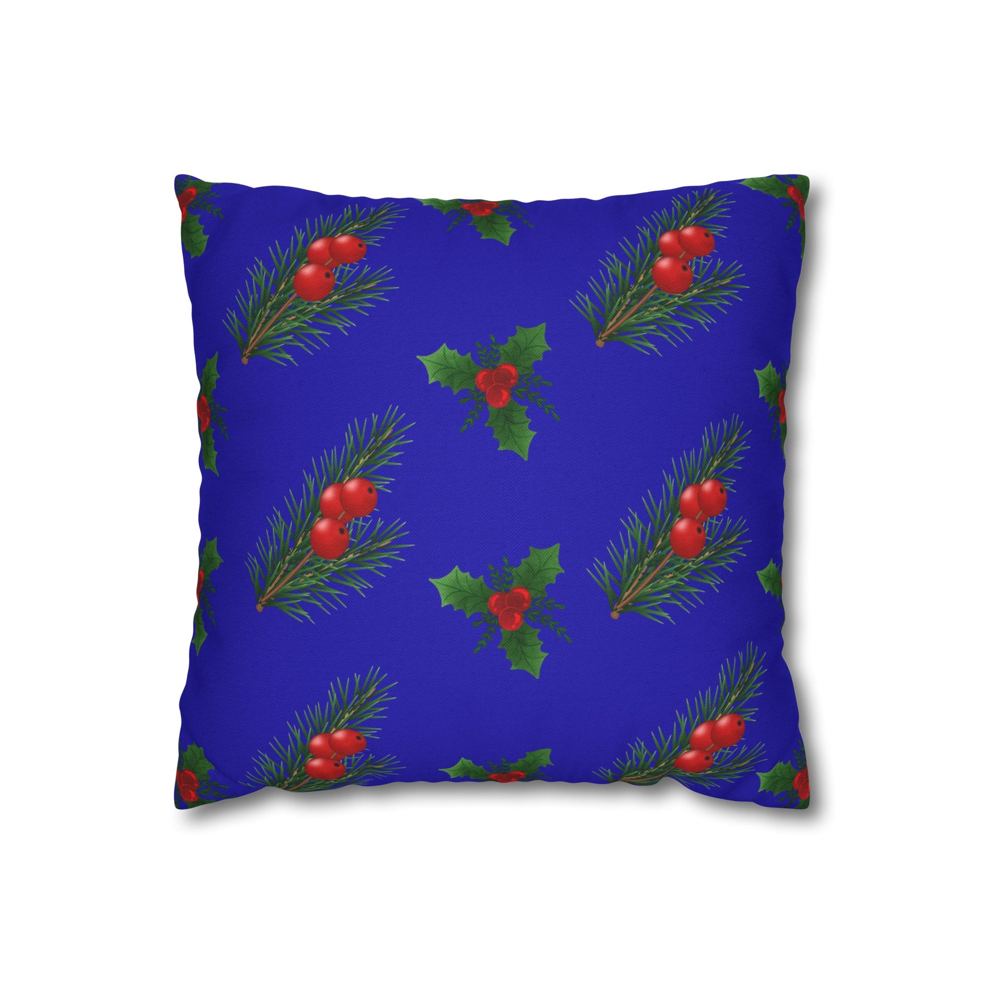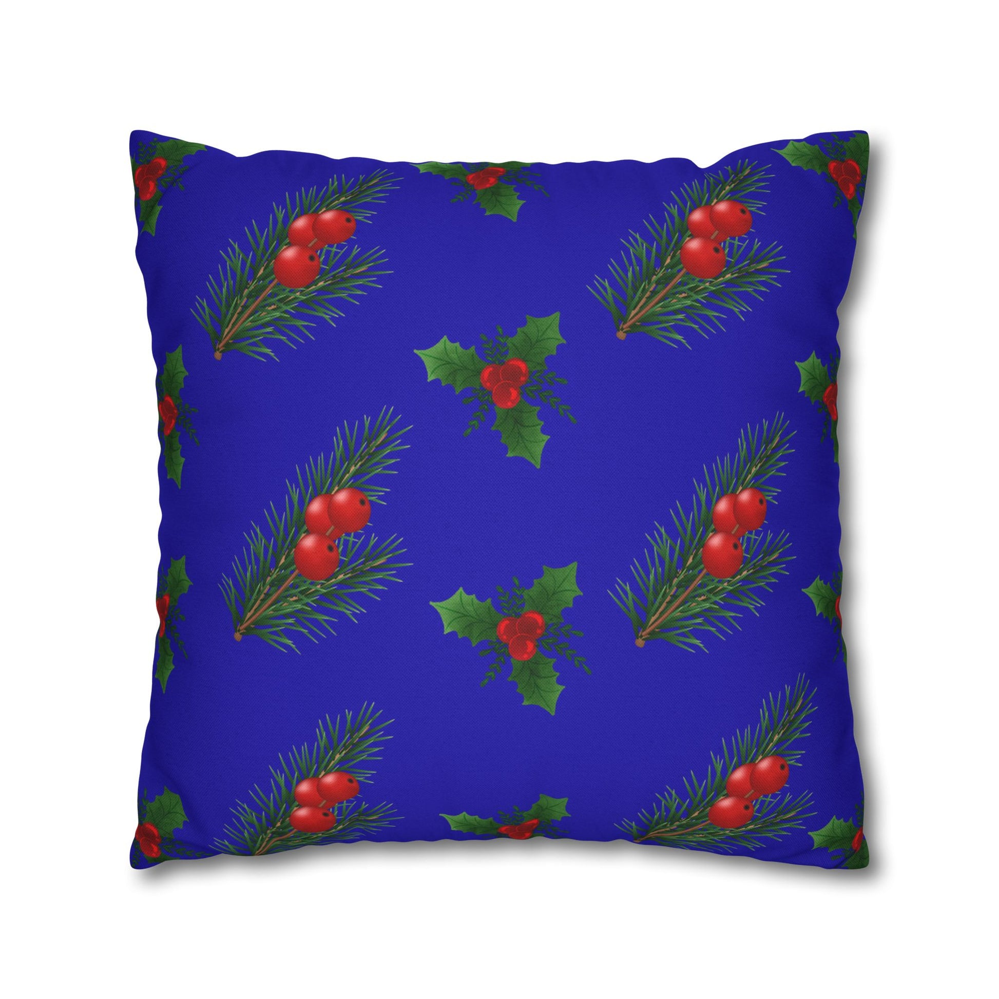 A cozy throw pillow cover that brings a quiet, festive charm to any room. Deep royal-blue fabric is patterned with hand-painted sprigs of pine and clusters of holly berries, creating a gentle, vintage holiday mood. The spun-polyester weave holds its shape and resists wrinkling, so the cover keeps a neat, tailored look on sofas, window seats, or tucked into a reading nook. Double-sided printing ensures the design wraps the piece, while a concealed beige zipper maintains a smooth edge. Use it to layer texture and color for seasonal decor that feels warm and lived-in.