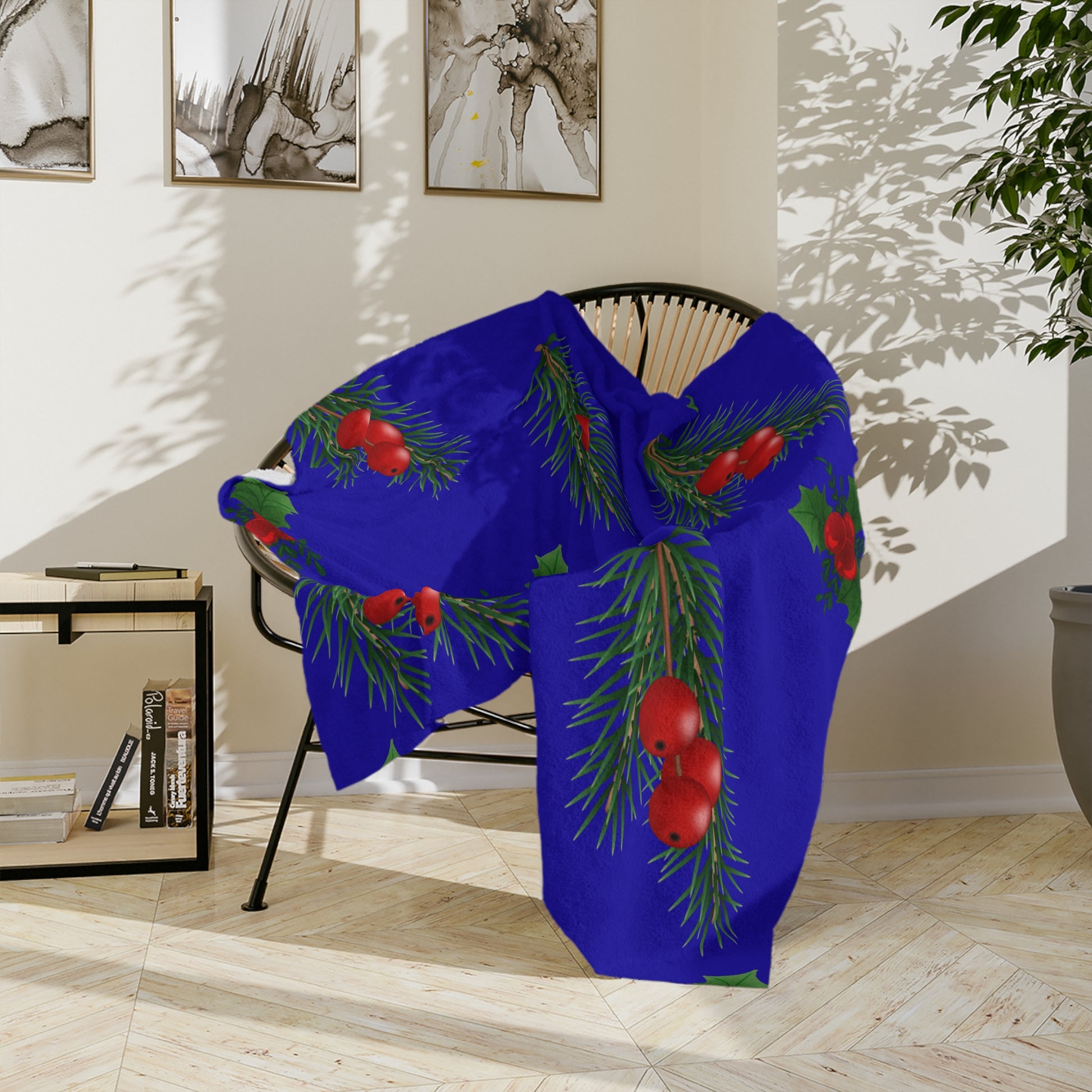 A deep, velvety throw inspired by classic winter greenery. This plush microfiber blanket wraps you in soft, cushiony warmth while a rich cobalt background makes sprigs of holly and pine pop in crisp, festive color. Drape it over a favorite armchair, layer it at the foot of a bed, or pull it around your shoulders during an evening of board games and cocoa. The stitched hem gives the piece structure and longevity so the print stays vivid through regular use. It feels like a quiet, cozy moment by the window on a snowy night — familiar, bright, and quietly festive.