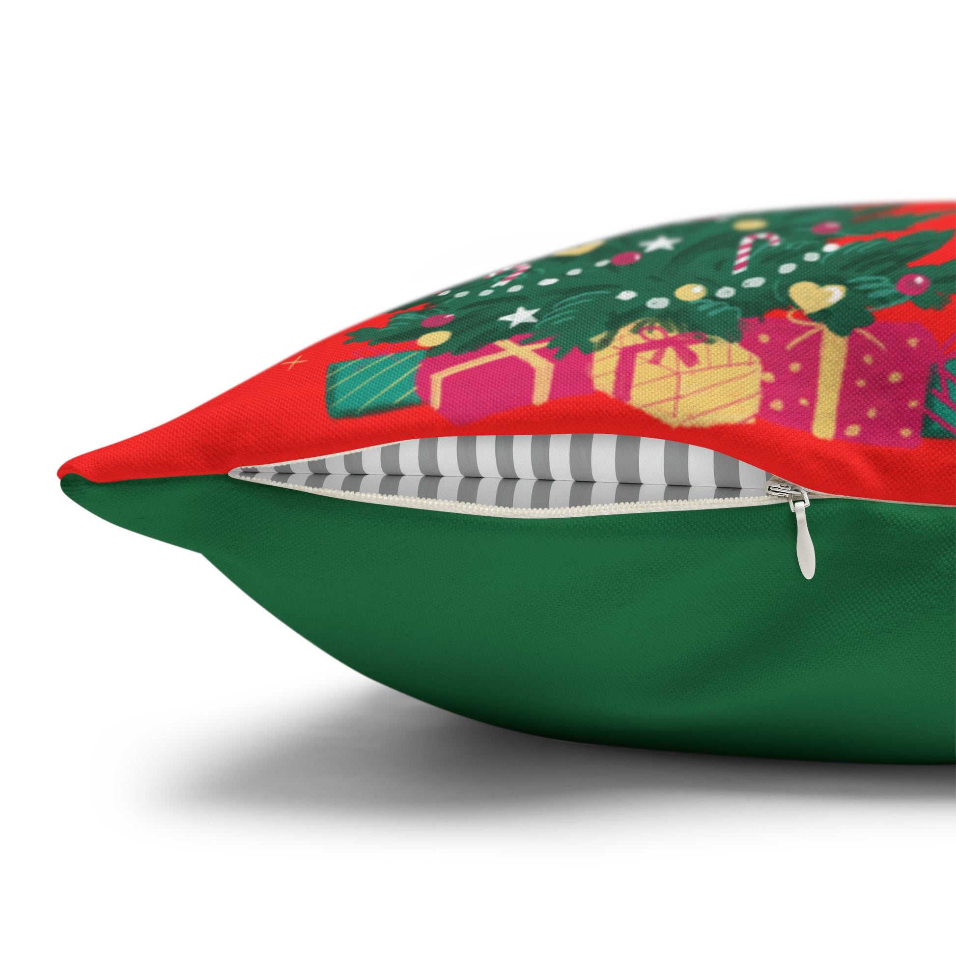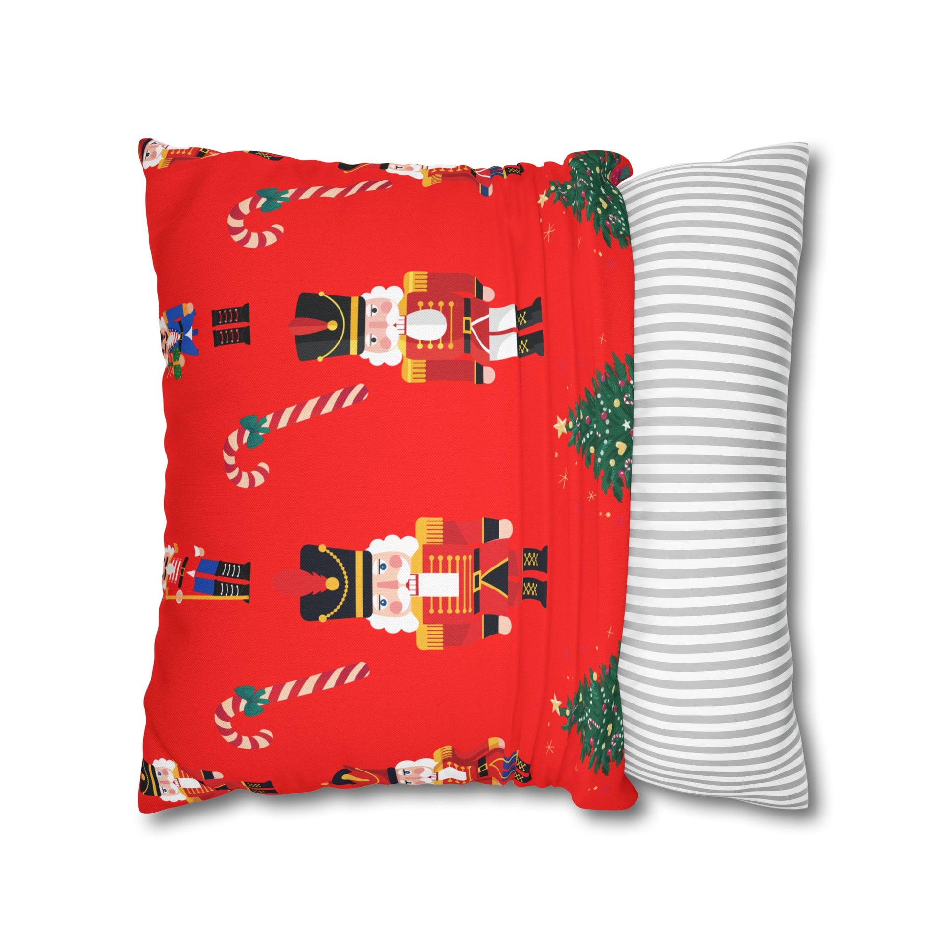Bright, festive, and cozy — this square pillow cover brings classic holiday charm to any living space. The double-sided, high-resolution print features cheerful nutcrackers, candy canes, and decorated firs set against a warm red backdrop that instantly lifts the room’s mood. The spun polyester fabric keeps the cover smooth and wrinkle-free, while a concealed beige zipper maintains the clean silhouette. Slip it over your favorite insert (not included) and let it anchor a seasonal mantel, a welcoming entry bench, or a family movie-night sofa with nostalgic, homey spirit.