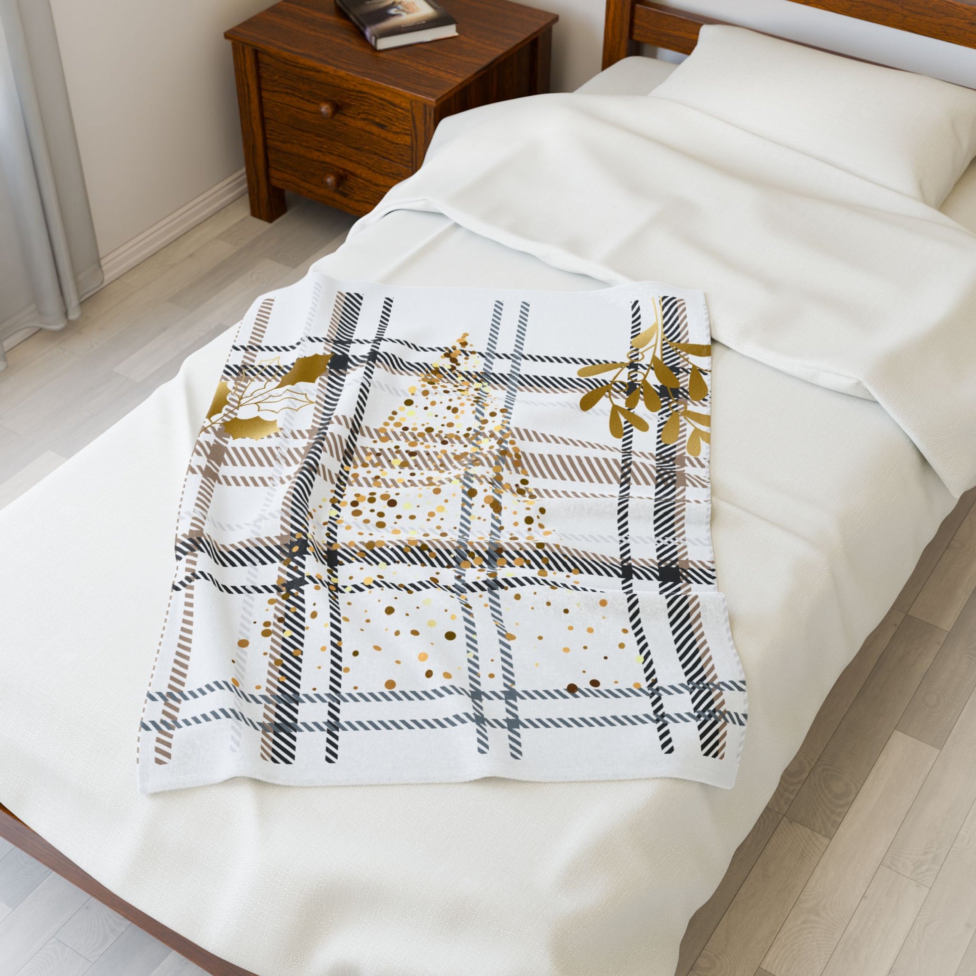 Plaid Gold Mistletoe Velveteen Plush Blanket — Holiday Cozy Throw