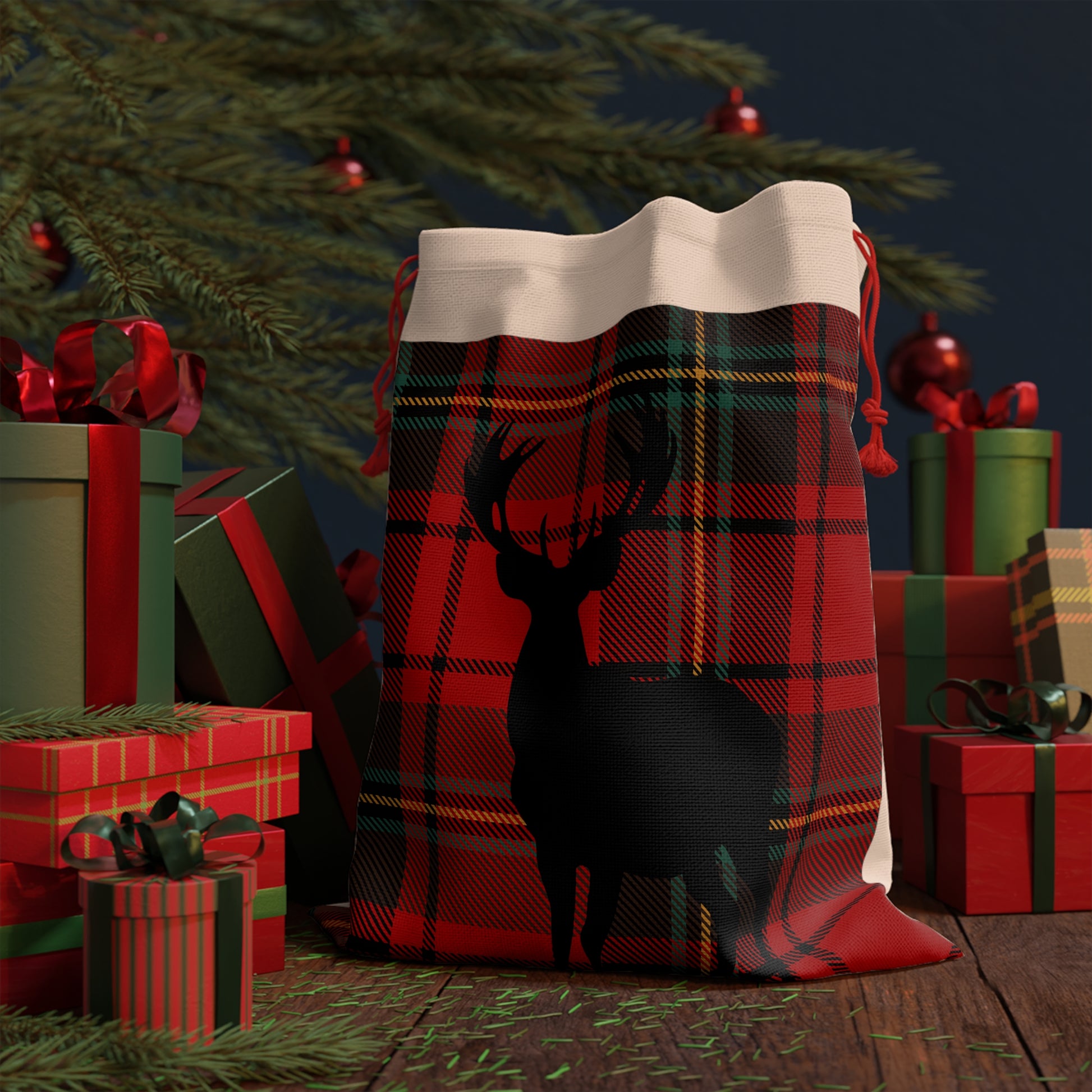 Plaid Reindeer Drawstring Gift Bag – Rustic Christmas Holiday Favor Sack
