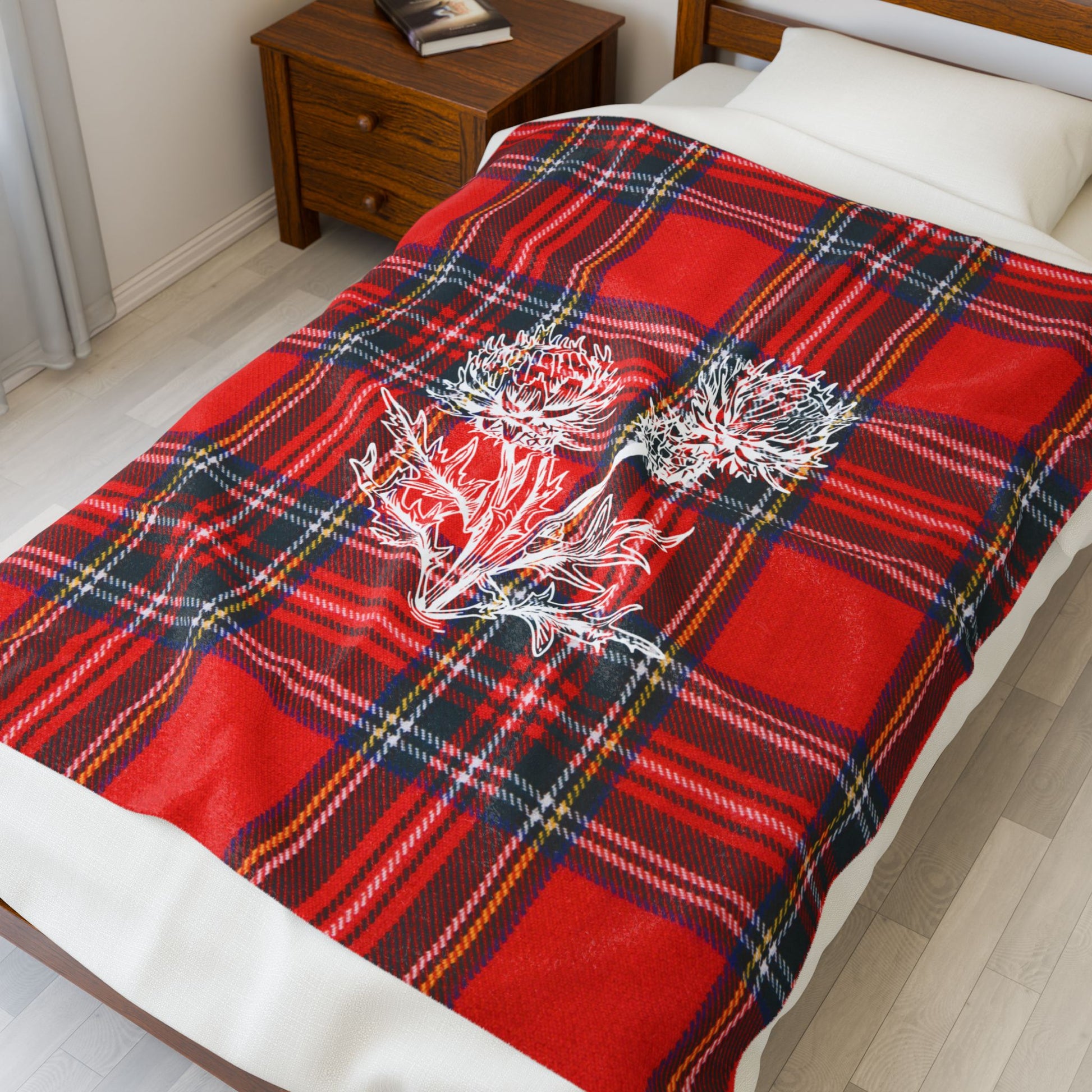 Red Tartan Velveteen Plush Blanket with White Thistle Print — Cozy Holiday Throw